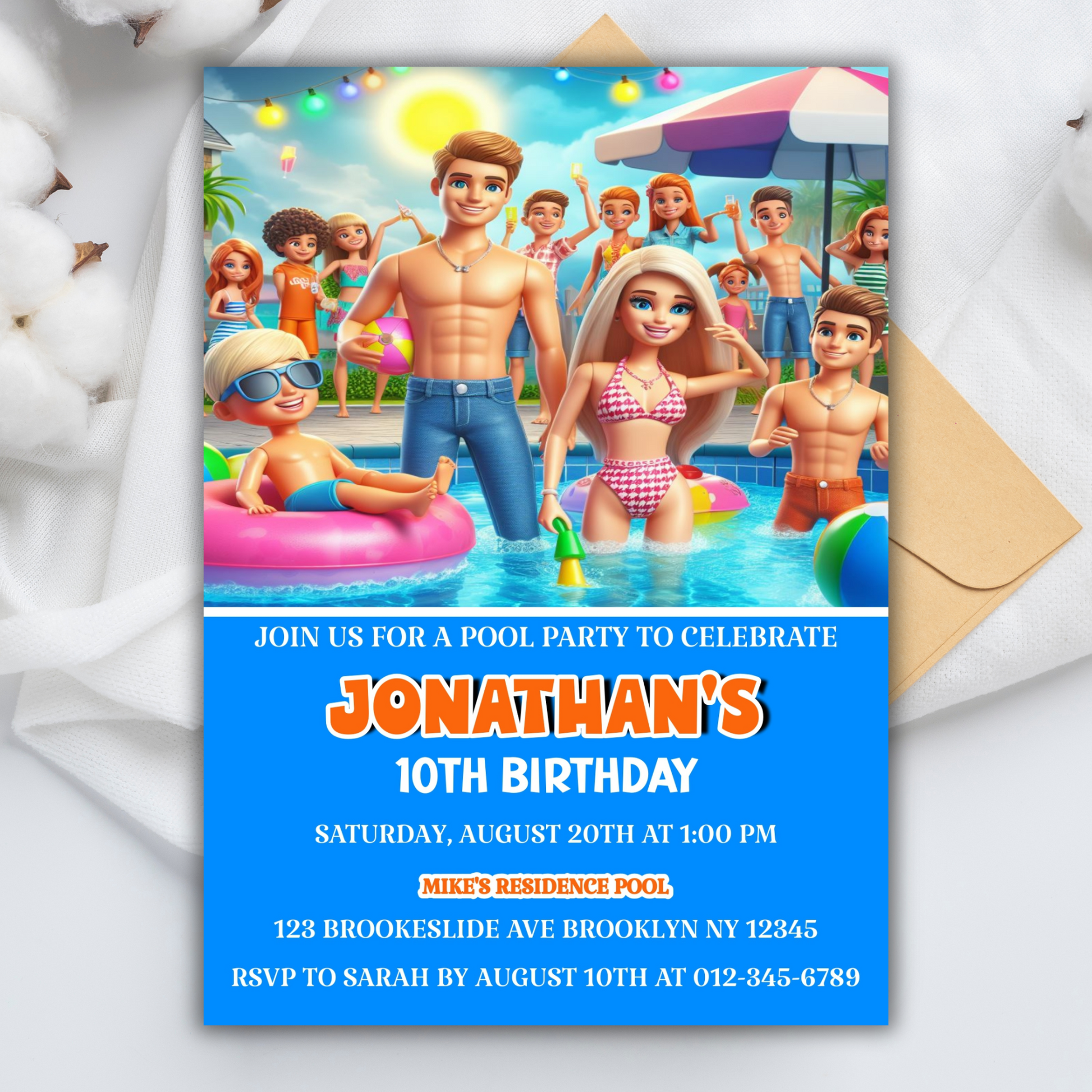 Barbie and Ken Pool Party Birthday Invitation, Cute Dolls Swim Party, Barbie Baby Doll Birthday Invitation, Barbie Pool Party Birthday Pink Invite
