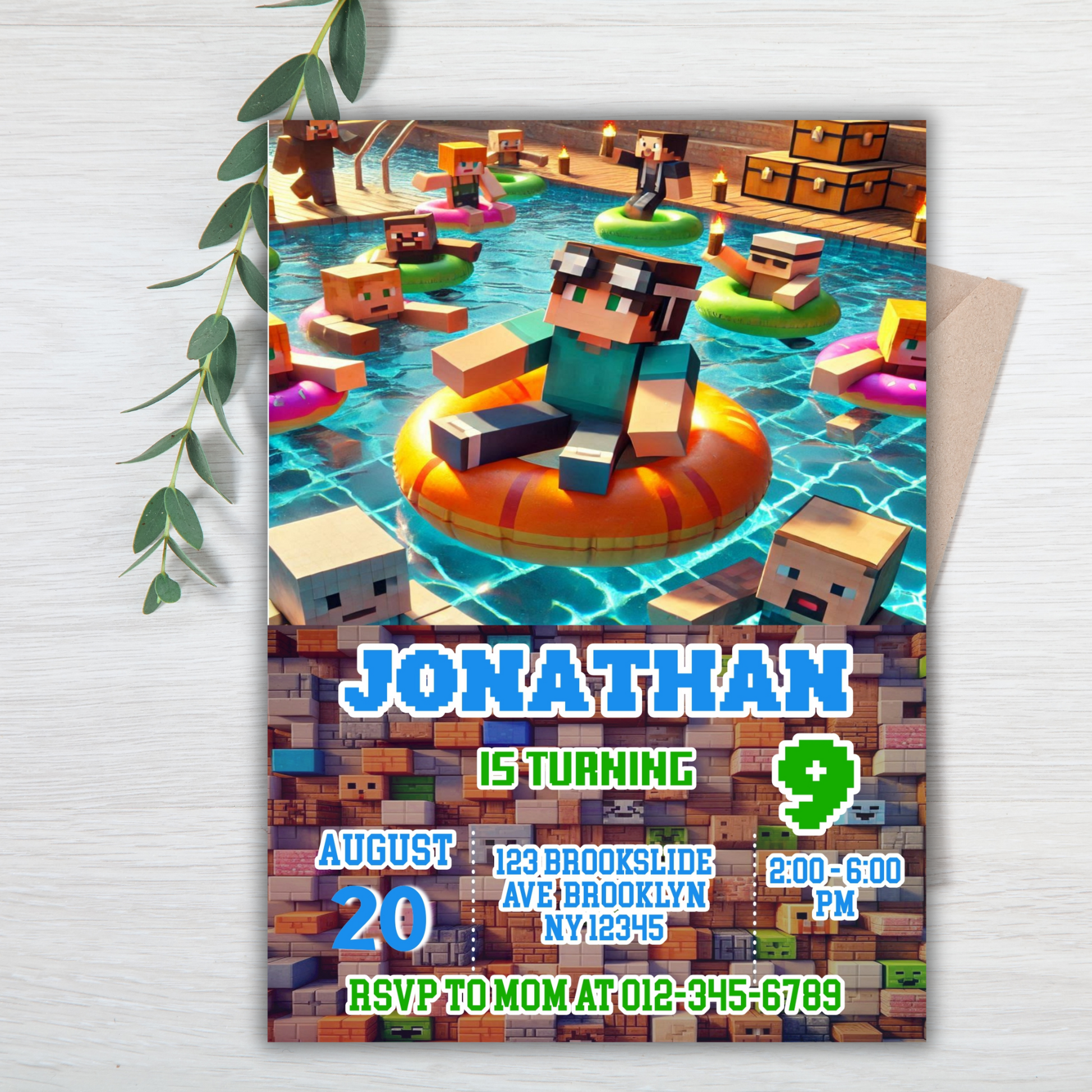 Minecraft Birthday Pool Party Invitation | Pink Digital Pixel Water Party Invite | Boy Minecraft Gamer Pool Party Birthday Digital Invite