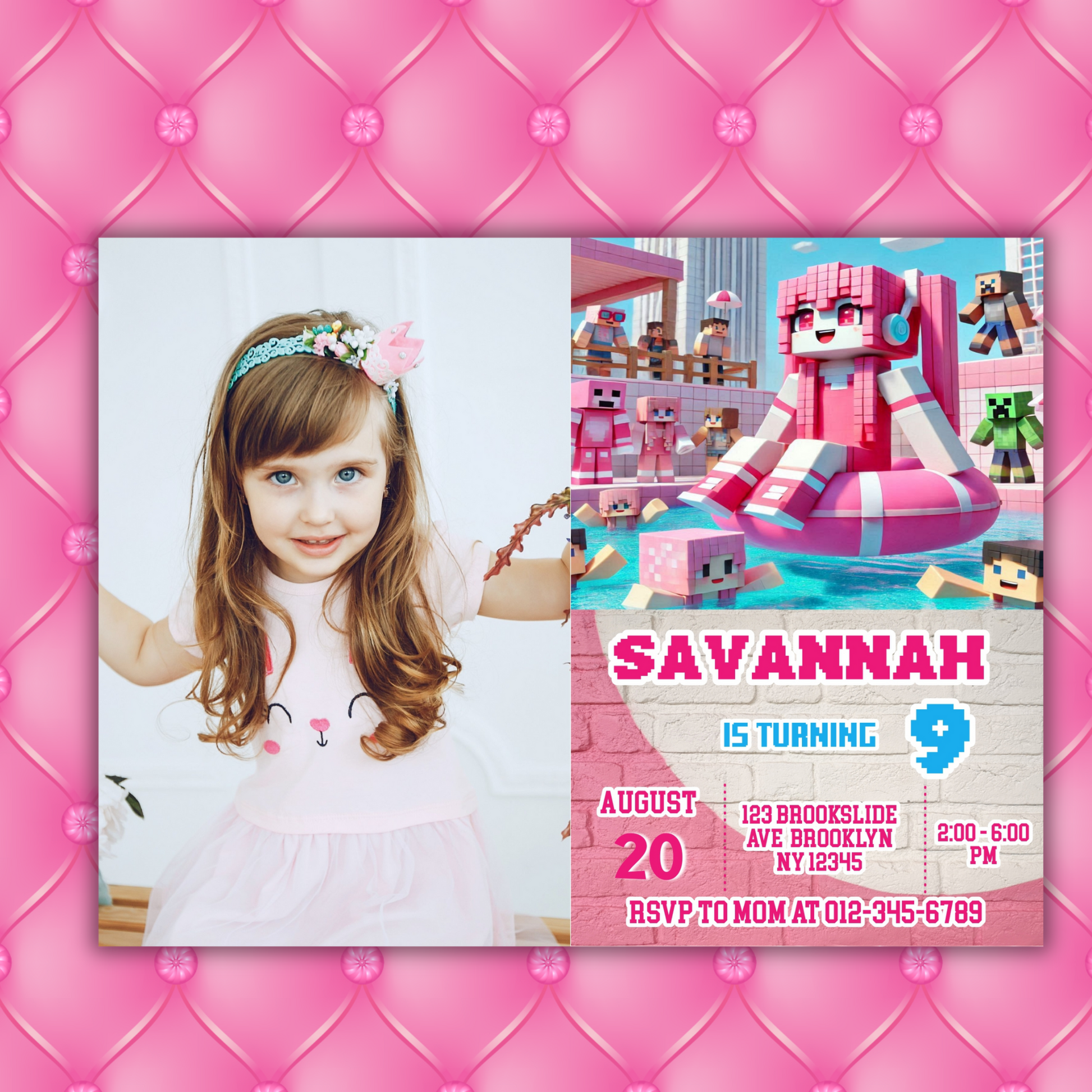Minecraft Picture Birthday Pool Party Invitation | Pink Picture Pixel Water Party Invite | Girl Minecraft Gamer Pool Party Birthday Digital Invite