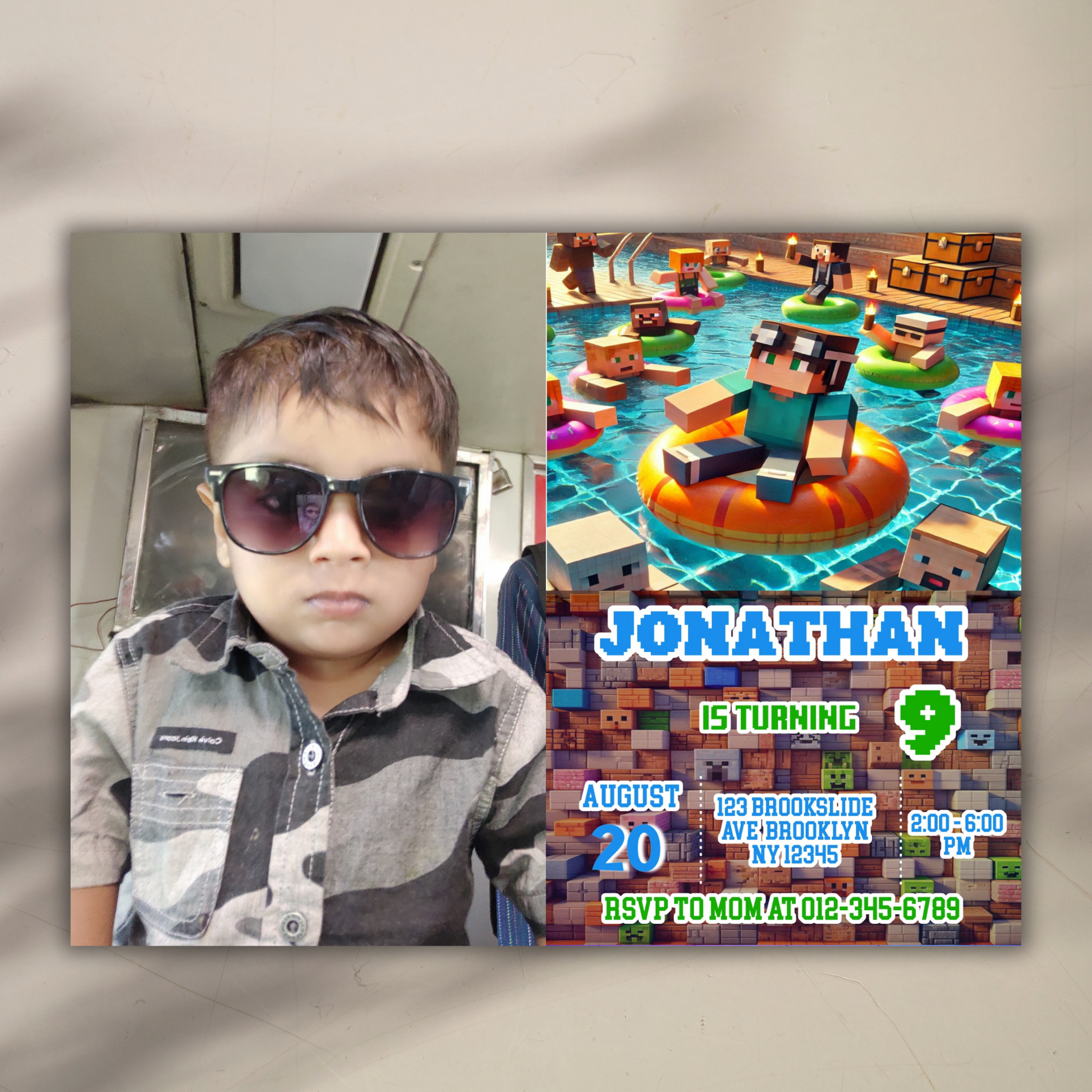 Minecraft Picture Birthday Pool Party Invitation | Pink Picture Pixel Water Party Invite | Boys Minecraft Gamer Pool Party Birthday Digital Invite