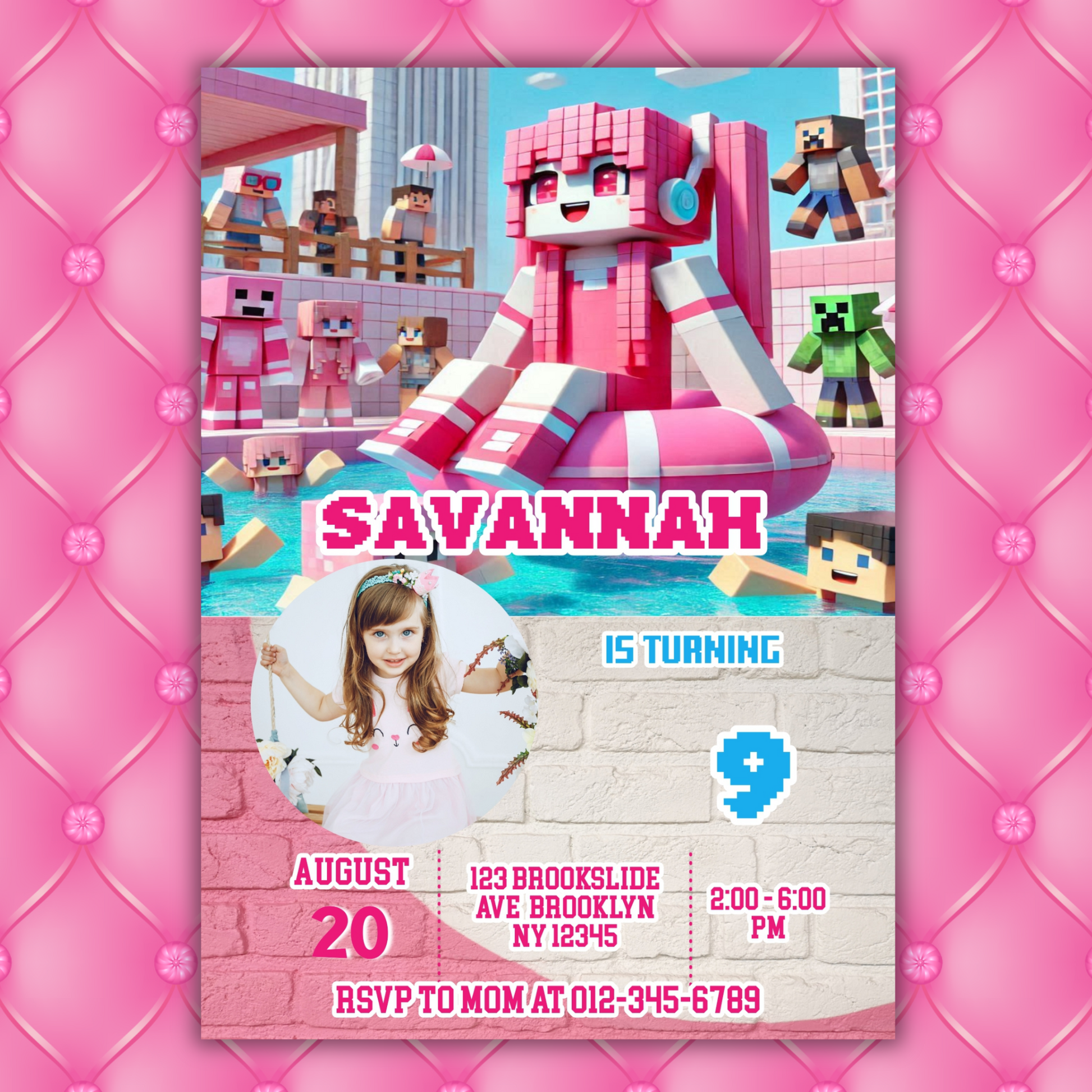 Minecraft Picture Birthday Pool Party Invitation | Pink Picture Pixel Water Party Invite | Girl Minecraft Gamer Pool Party Birthday Digital Invite